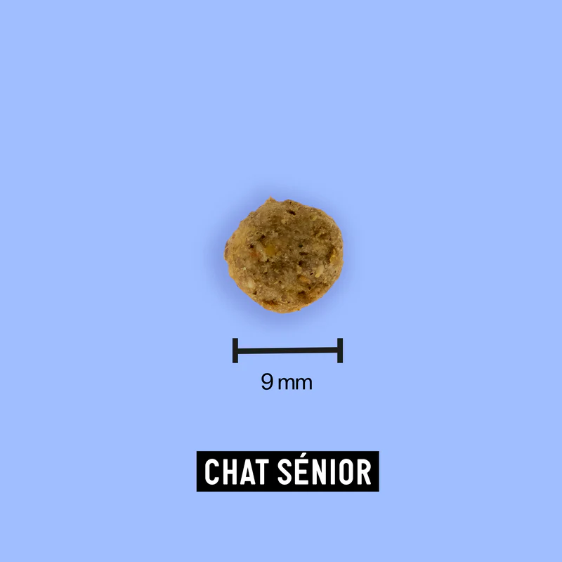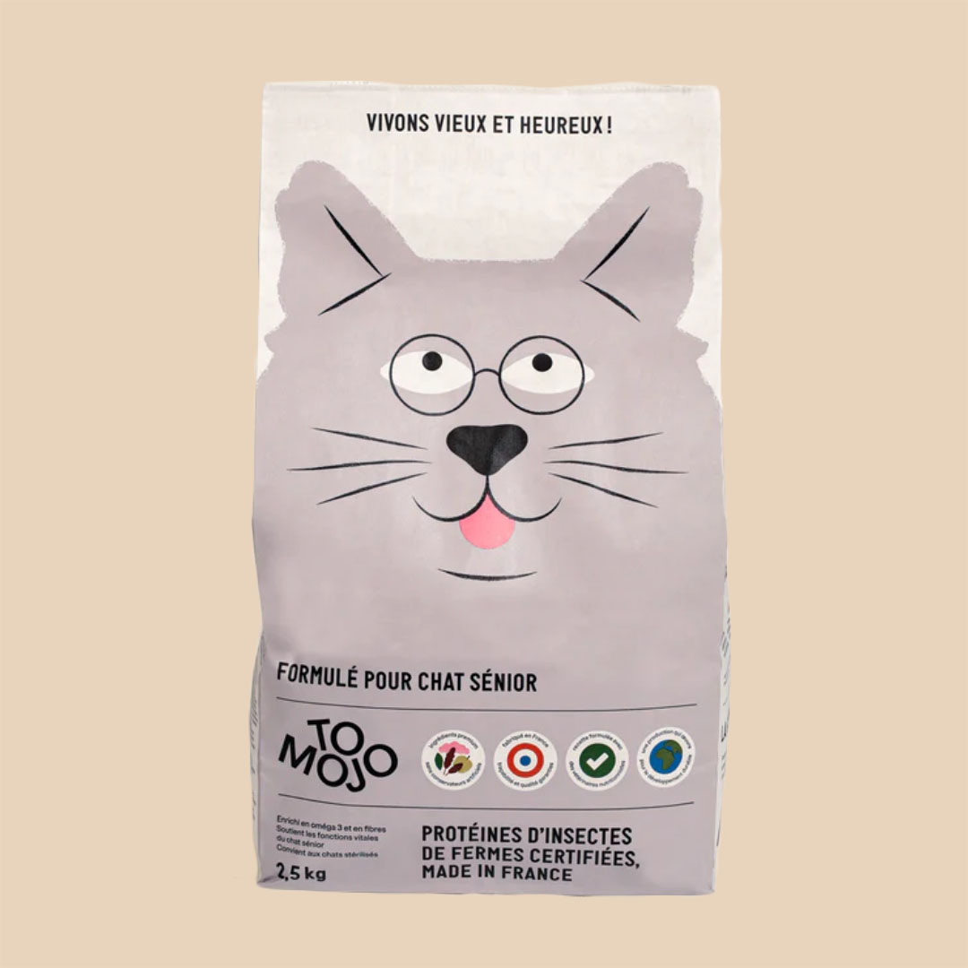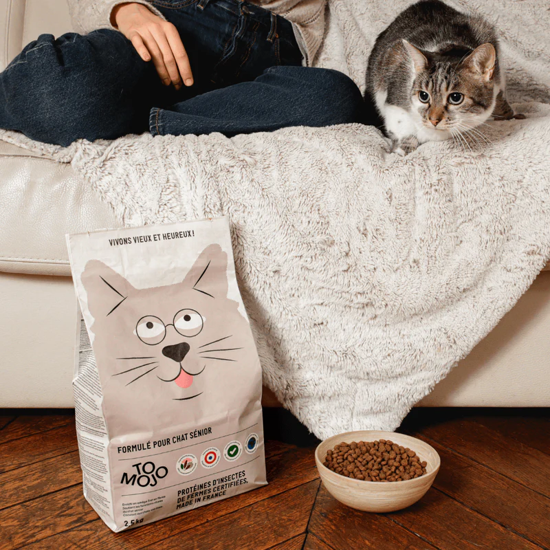 Pienso para gatos senior a base de insectos. Enriquecida con omega 3 y fibra para tratar las bolas de pelo
