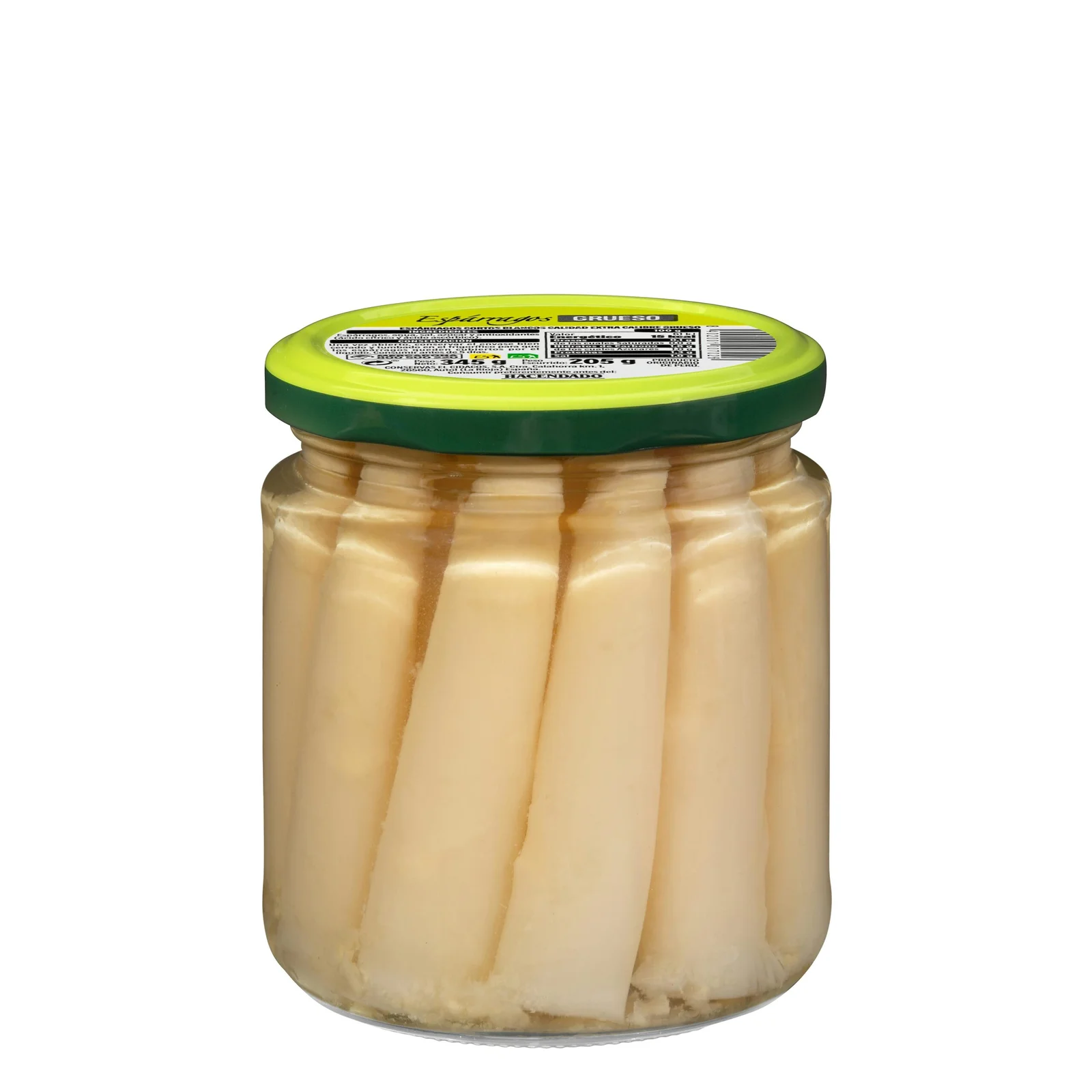 Espárragos blancos gruesos Hacendado cortos, un clásico del mercado español. Forma parte de la variedad de conservas verdura. Ideal para españoles fuera de Europa que buscan sabores de casa y para europeos que desean productos auténticos de España.