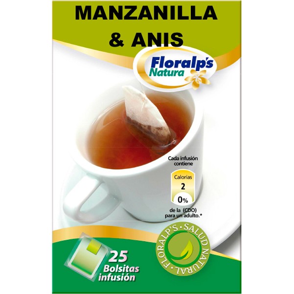 La Infusión de Manzanilla con Anís de Floralp’s posee propiedades digestivas, relajantes, ayuda a eliminar gases y fluidifica el moco bronquial, ayuda a eliminar la tos y ayuda a dormir. además reduce las molestias propias de la menstruación y es galactógena, además de aumentar la líbido.