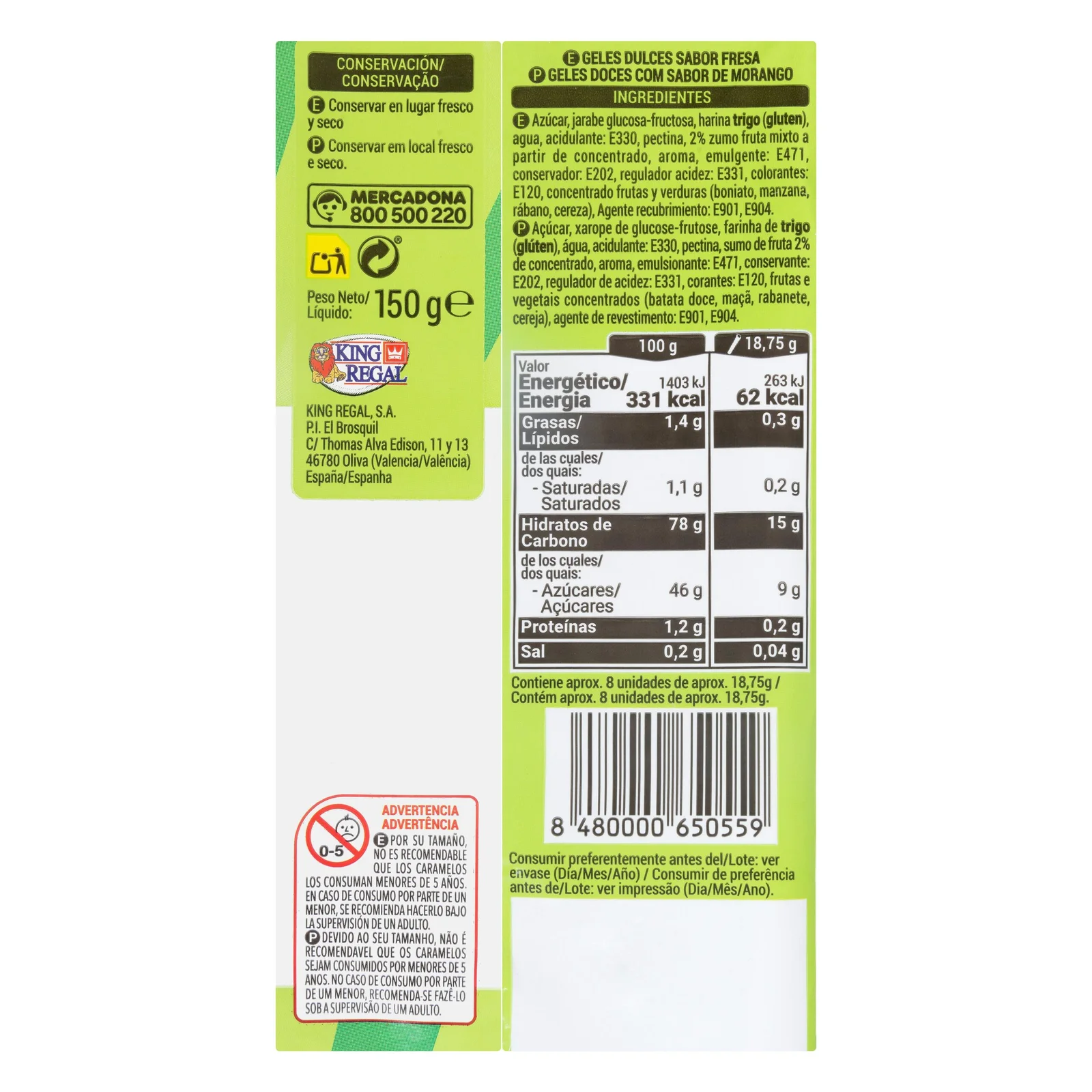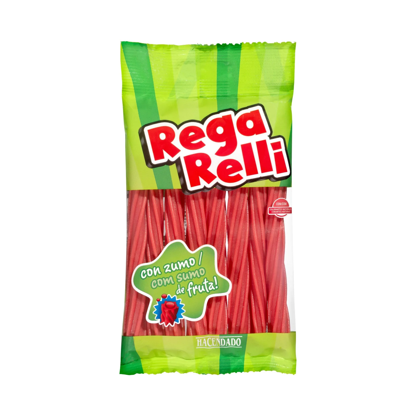 Golosinas Rega Relli Hacendado rellena con zumo de fruta, un clásico del mercado español. Forma parte de la variedad de golosinas que tanto gustan en España. Ideal para españoles que viven fuera de Europa y quieren revivir los sabores de casa, o para europeos que desean descubrir la auténtica tradición española.