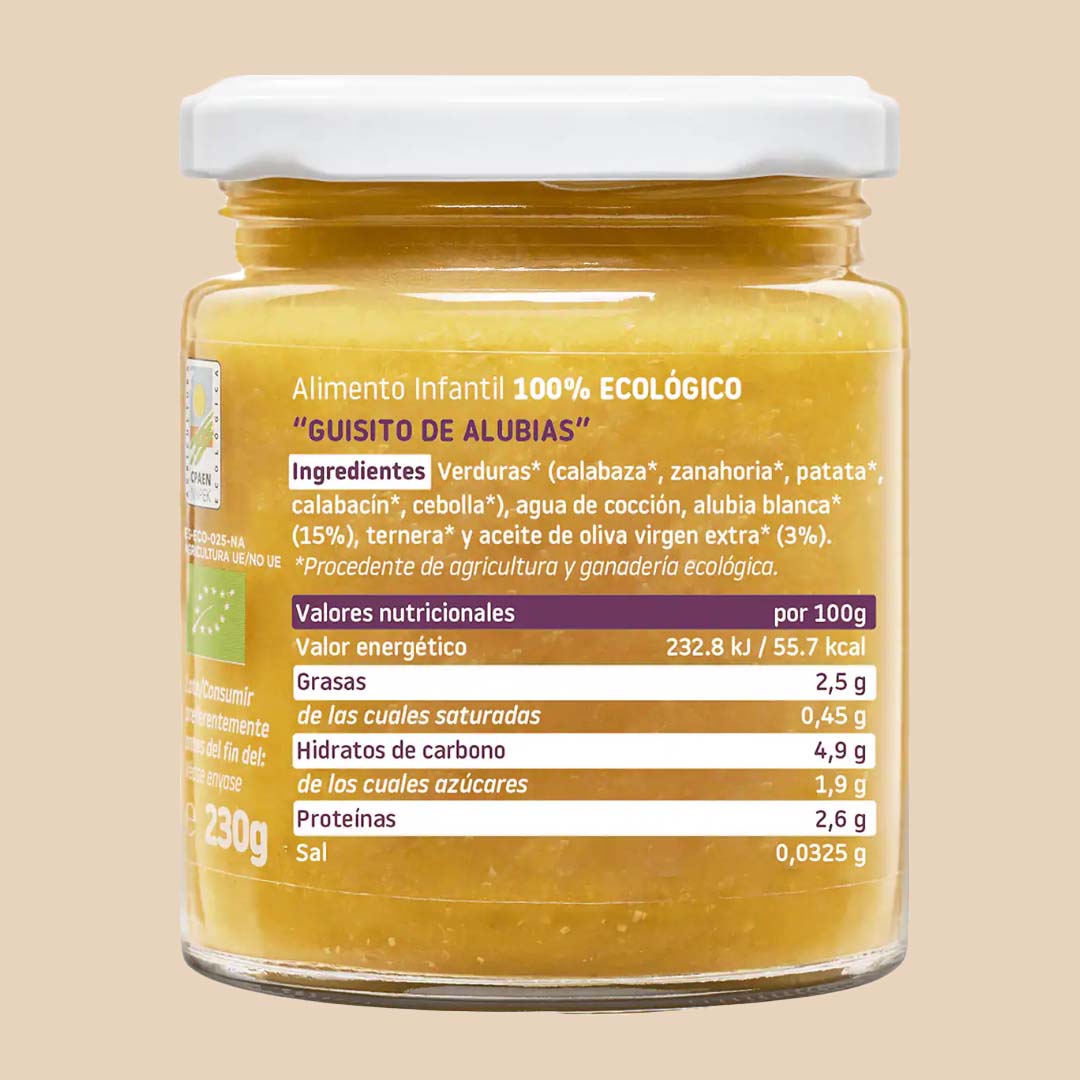 Tarrito para peques de guisito de verduras, ternera y alubias. Listo para calentar y tomar