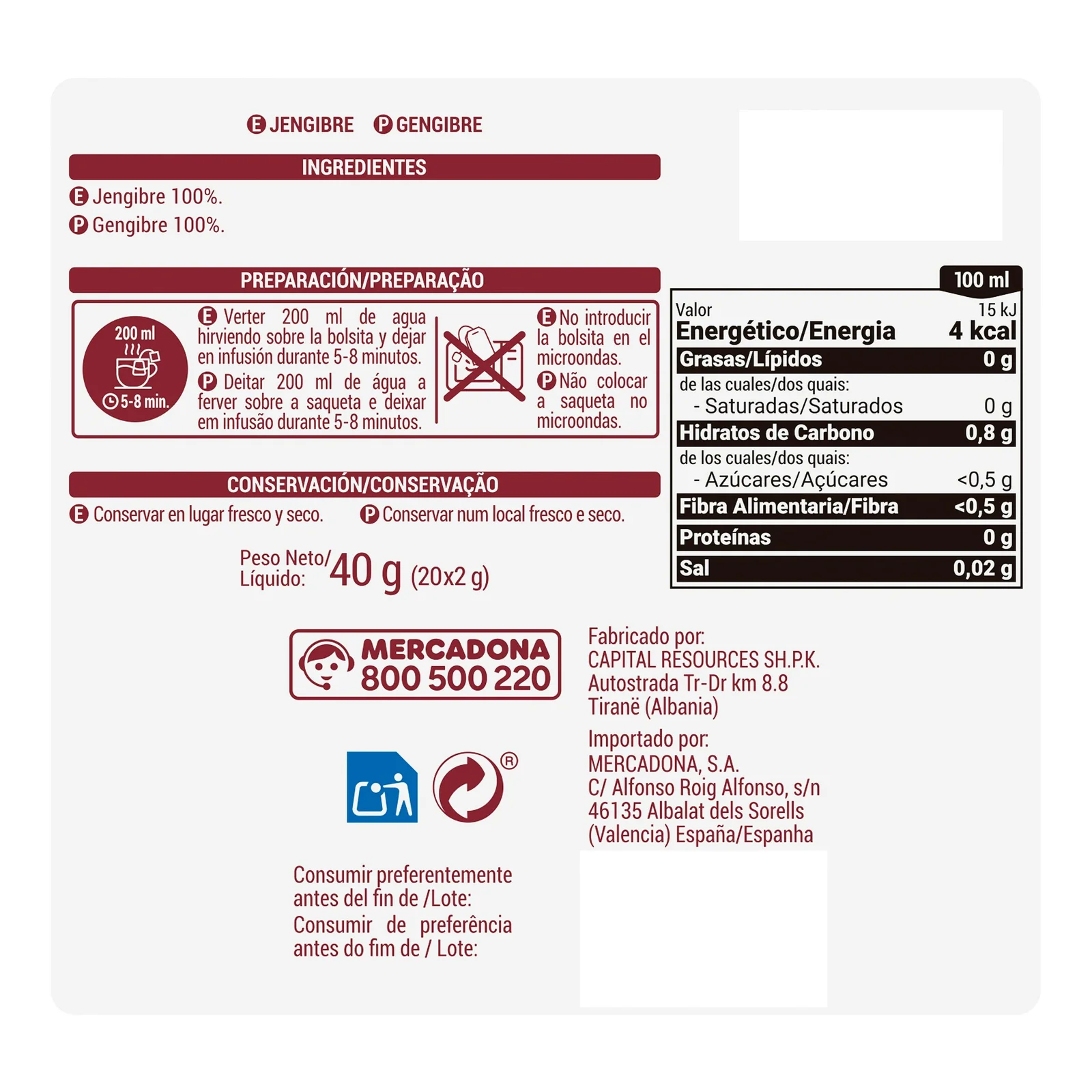 Infusión Jengibre Hacendado con auténtico sabor de España.