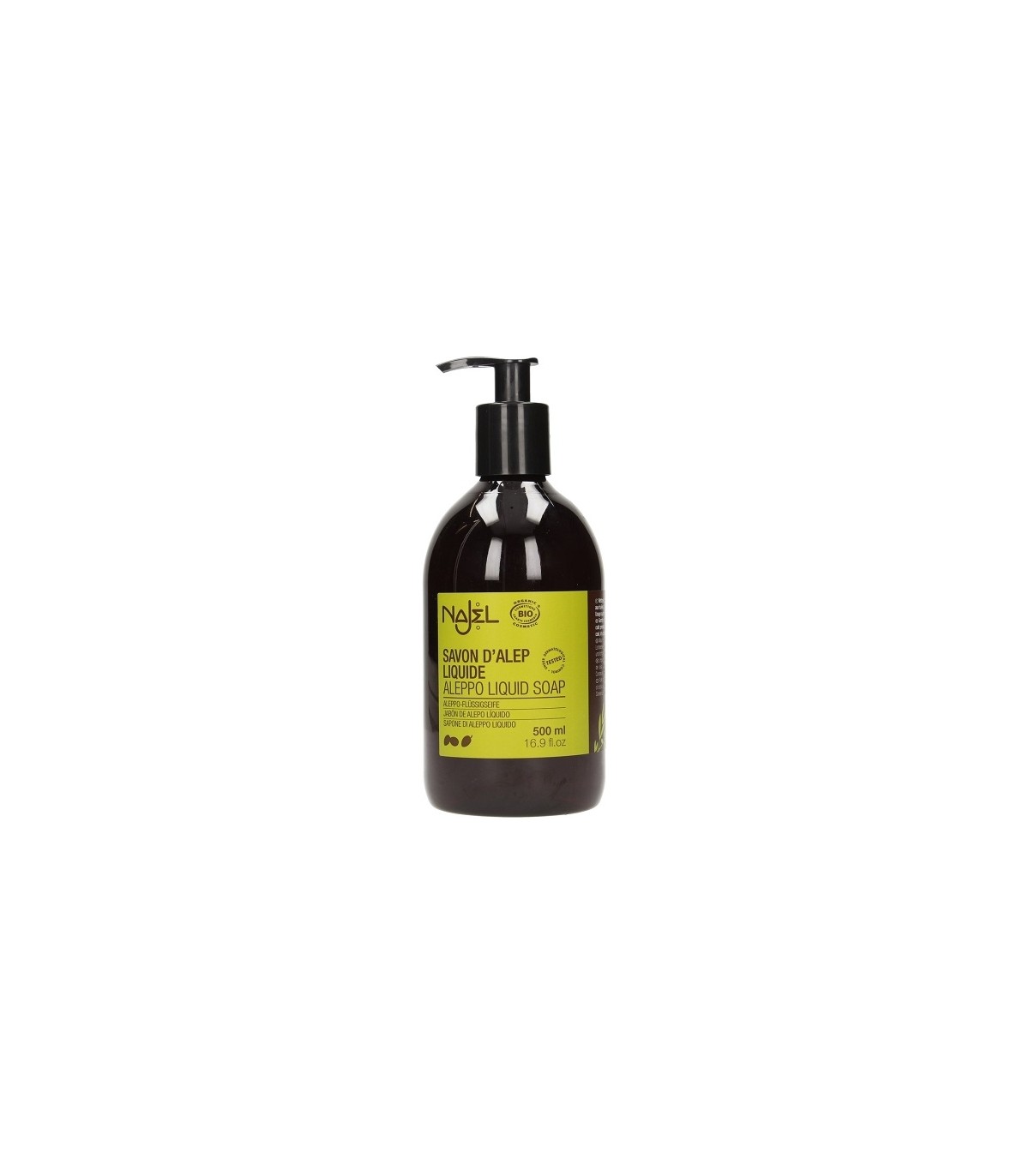 Jabón tradicional artesano extra natural de Aleppo presentado en formato líquido de 500 ml con dosificador. Realizado con aceite de oliva, laurel y almendras dulces . Se puede utilizar en cara y cuerpo.