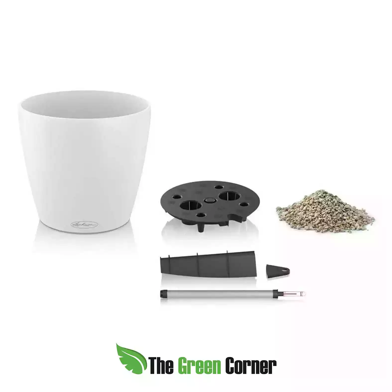 El set completo se compone de la jardinera CLASSICO Color, incluido el sistema de riego con base separadora e indicador de nivel de agua, así como el sustrato para plantas LECHUZA-PON como capa de drenaje.