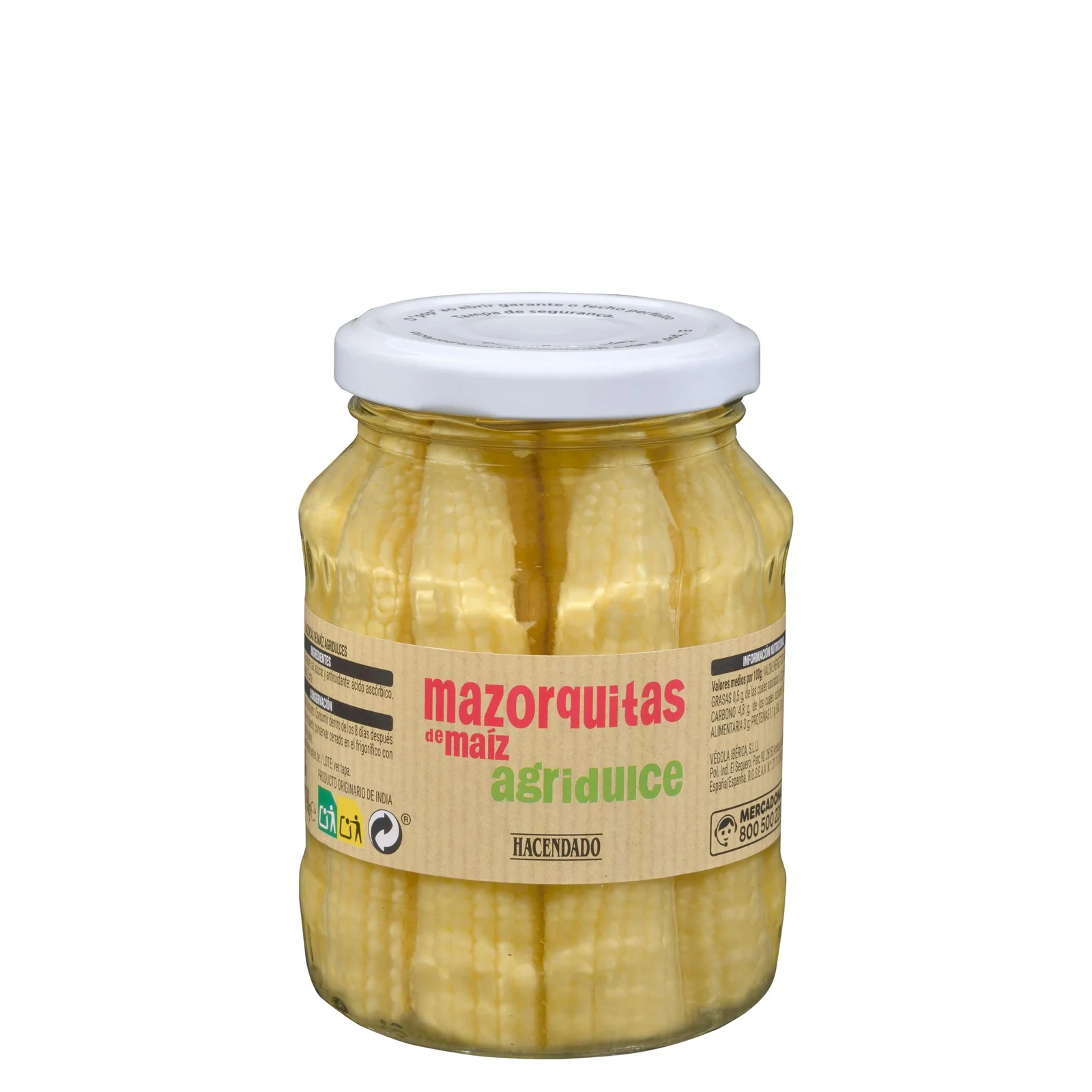 Mazorquitas de maíz agridulce Hacendado, un clásico del mercado español. Forma parte de la variedad de conservas verdura. Ideal para españoles fuera de Europa que buscan sabores de casa y para europeos que desean productos auténticos de España.