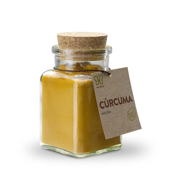 Cúrcuma molida gourmet ecológica sin alérgenos, sin GMO en envase libre de BPA.