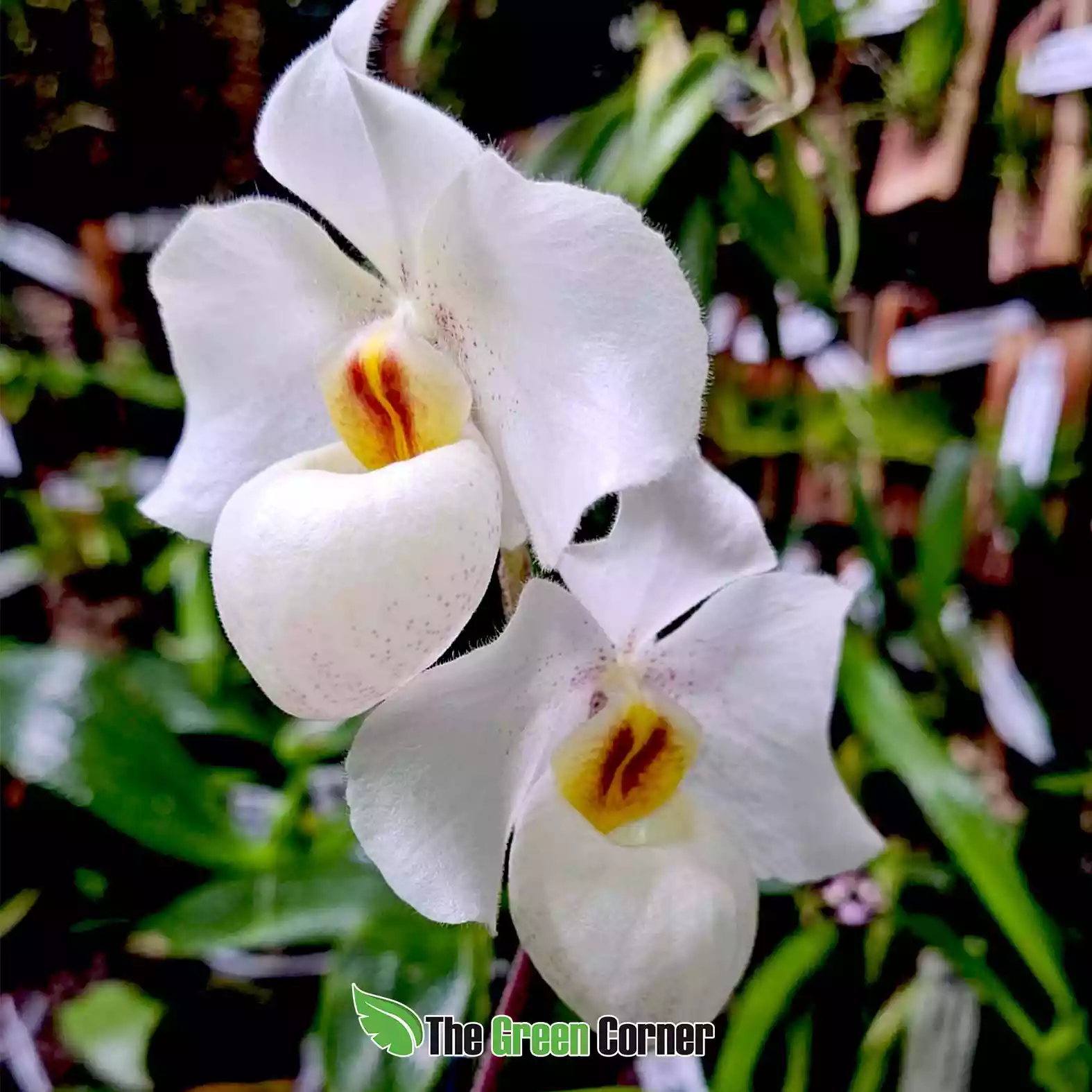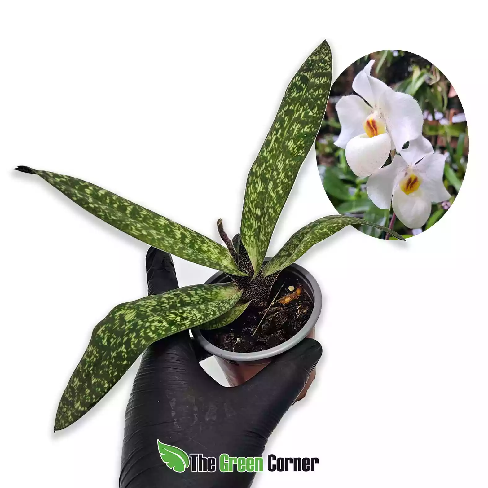Prefiere temperaturas frescas a intermedias, con buena humedad ambiental y luz indirecta brillante. Se cultiva en sustrato específico para Paphiopedilum, con mezcla de corteza fina, perlita y algo de musgo sphagnum, y requiere riegos regulares evitando el encharcamiento. Aunque no es perfumada, su floración es muy duradera, y la flor puede mantenerse en perfecto estado durante varias semanas. Perfecta para interiores bien iluminados o invernaderos protegidos, esta variedad aporta un toque de elegancia y exotismo con su color claro y forma singular. Paphiopedilum Armeni White está disponible en The Green Corner, donde seleccionamos cuidadosamente cada ejemplar para garantizar su calidad y salud.