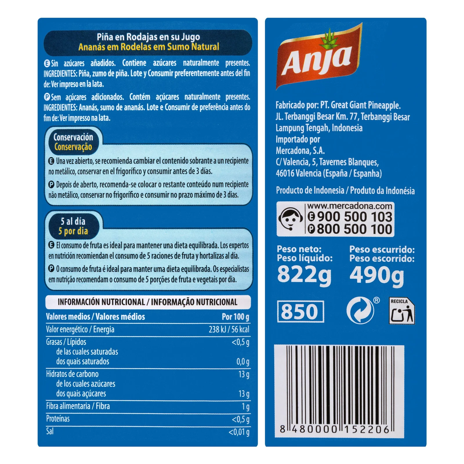 Piña en su jugo Hacendado rodajas con auténtico sabor español.