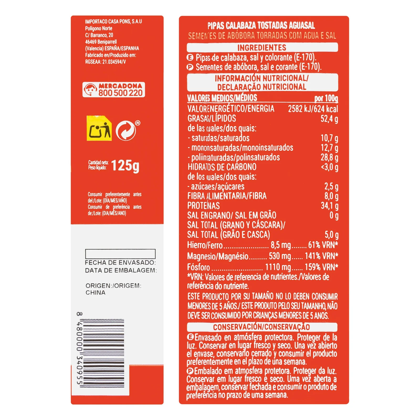 Pipas calabaza tostadas aguasal, producto típico del mercado español.