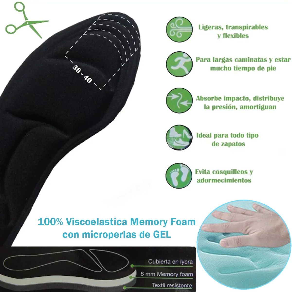 Plantillas fabricadas en espuma viscoelástica memory foam con infusión de MICROPERLAS DE GEL . Ajustables (recortar) para las Tallas 36 – 40.
