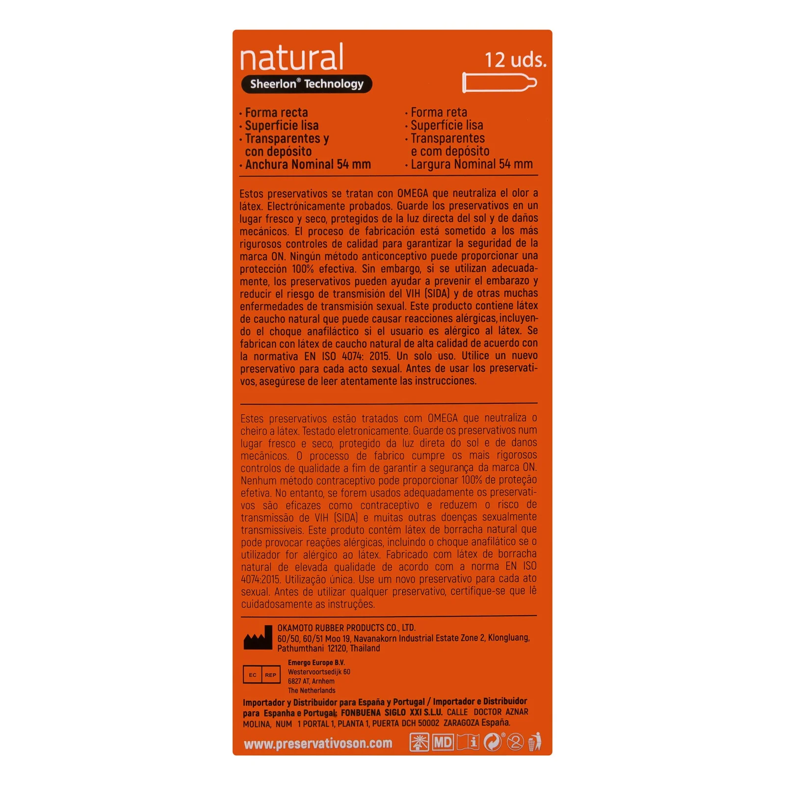 Preservativos natural On, un producto típico disponible en España. Pertenece a la variedad de preservativos. Ideal para españoles que viven fuera de Europa y quieren seguir cuidándose con productos que conocen, y para europeos que buscan referencias auténticas del mercado español.