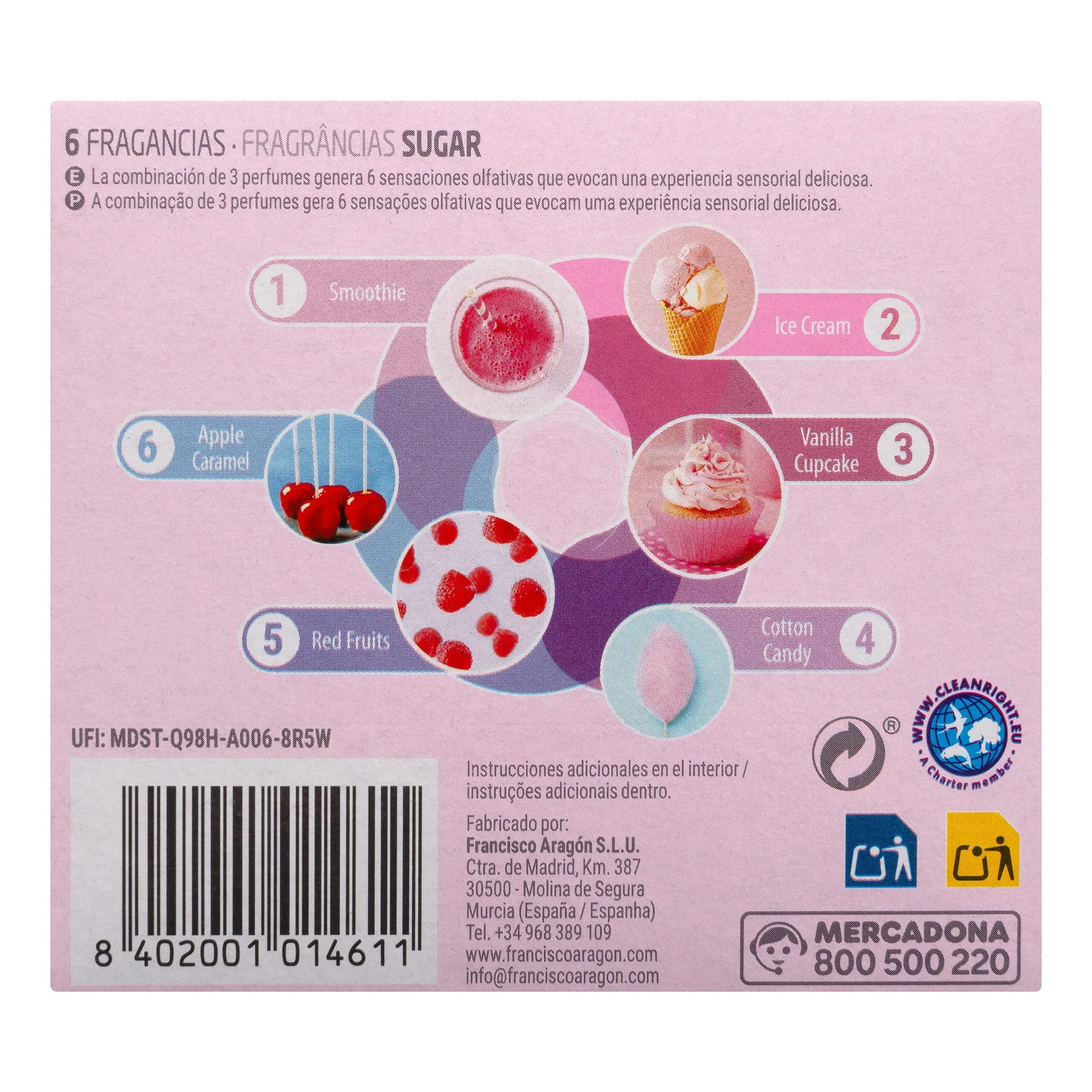 Recambio ambientador eléctrico Sugar 6 fragancias Bosque Verde es un producto de limpieza del hogar seleccionado dentro de la sección Insecticida y ambientador de nuestro Mercado Español. Pensado para españoles que viven fuera y quieren seguir usando sus productos de siempre, y para clientes europeos que valoran la calidad y eficacia de la limpieza ‘a la española’.