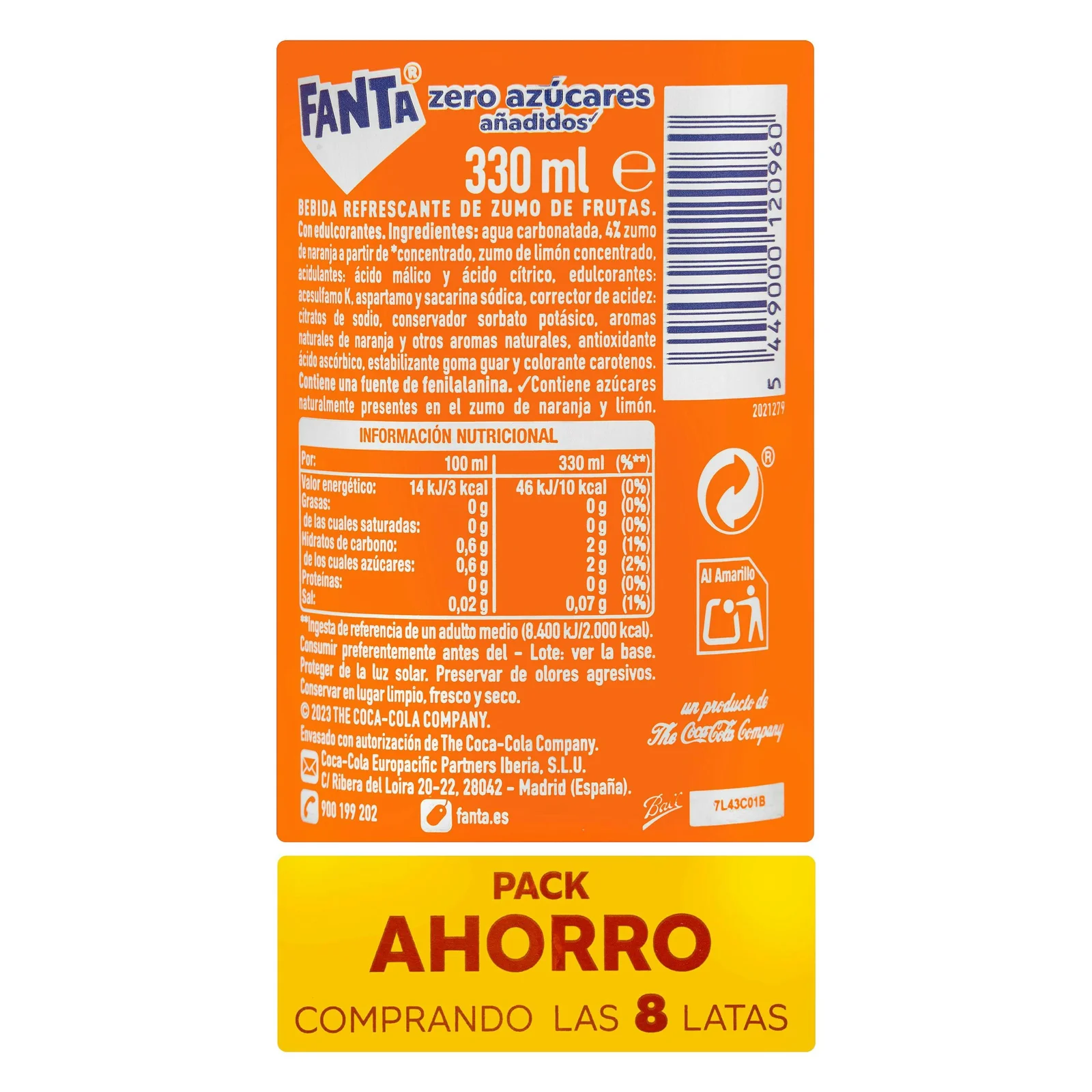Refresco Fanta naranja zero azúcares añadidos. Bebida refrescante del mercado español. Disfrútala fría en tus comidas o como refresco diario.