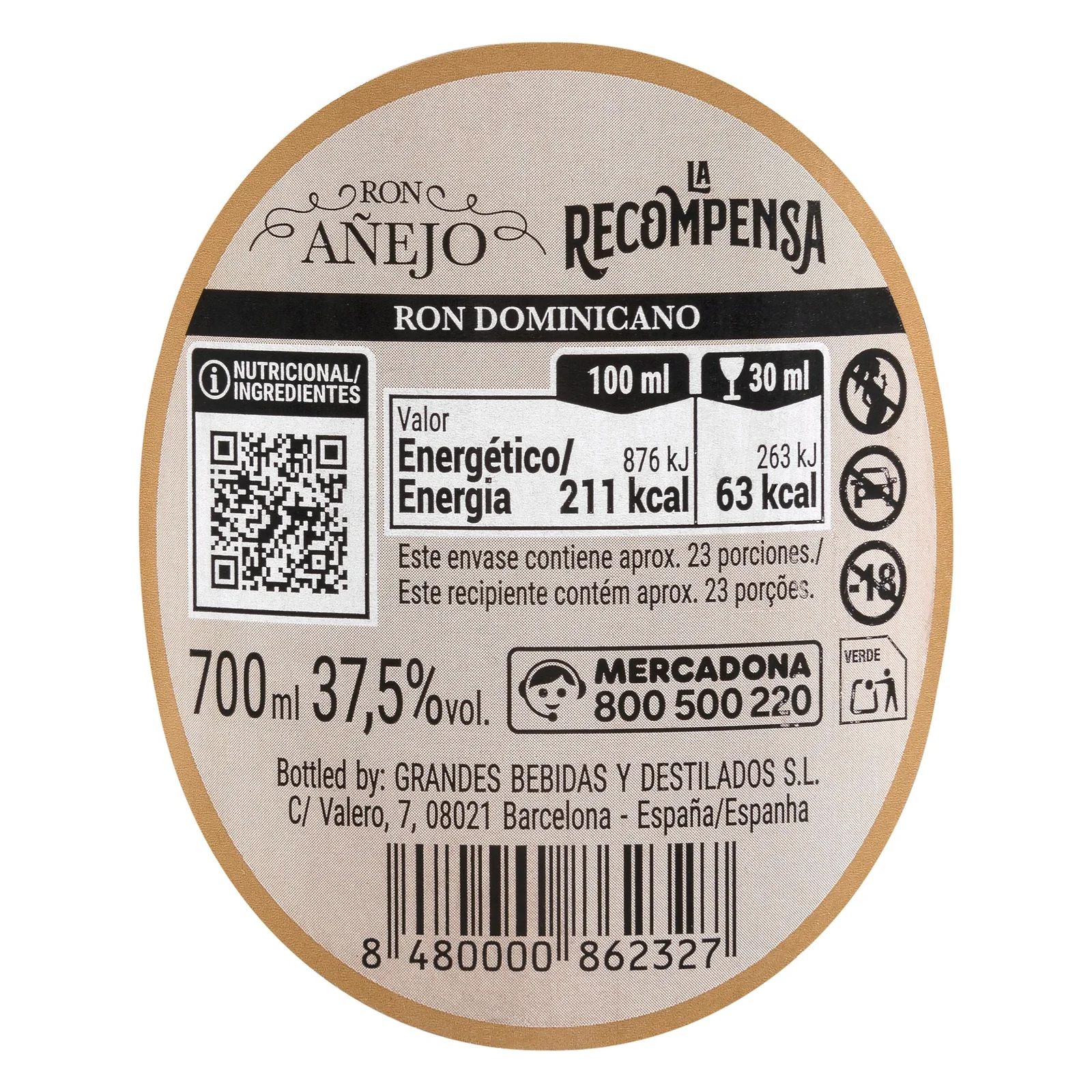 Ron añejo La Recompensa es una bebida española seleccionada, pensada para españoles que viven fuera y para amantes de la gastronomía española en toda Europa. Forma parte de nuestra categoría de Bodega y Licores > Licores, destilados y cremas, ofreciendo tradición, calidad y sabor auténtico.