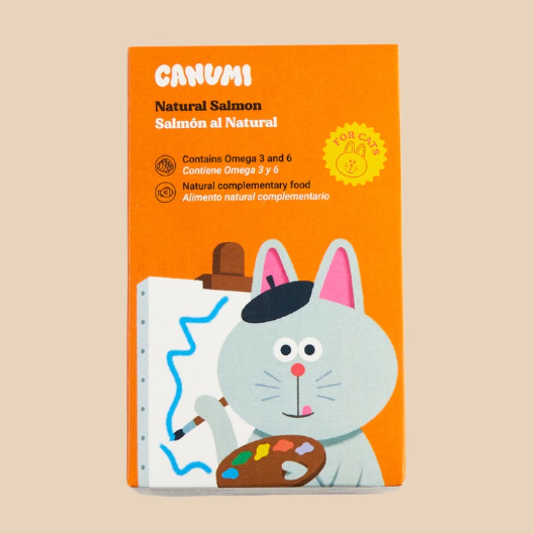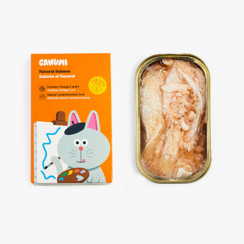 Conserva al natural de salmón es una excelente opción complementaria para gatos debido a su alto contenido en proteínas y ácidos grasos omega-3 y omega-6. Estos nutrientes apoyan el desarrollo muscular, la salud cardiovascular, la piel, el pelaje, y la función cognitiva. Además, sus propiedades antiinflamatorias benefician a gatos mayores o con condiciones inflamatorias, contribuyendo a su bienestar general. Hecha a mano, cocinada sólo con agua y sin sal.