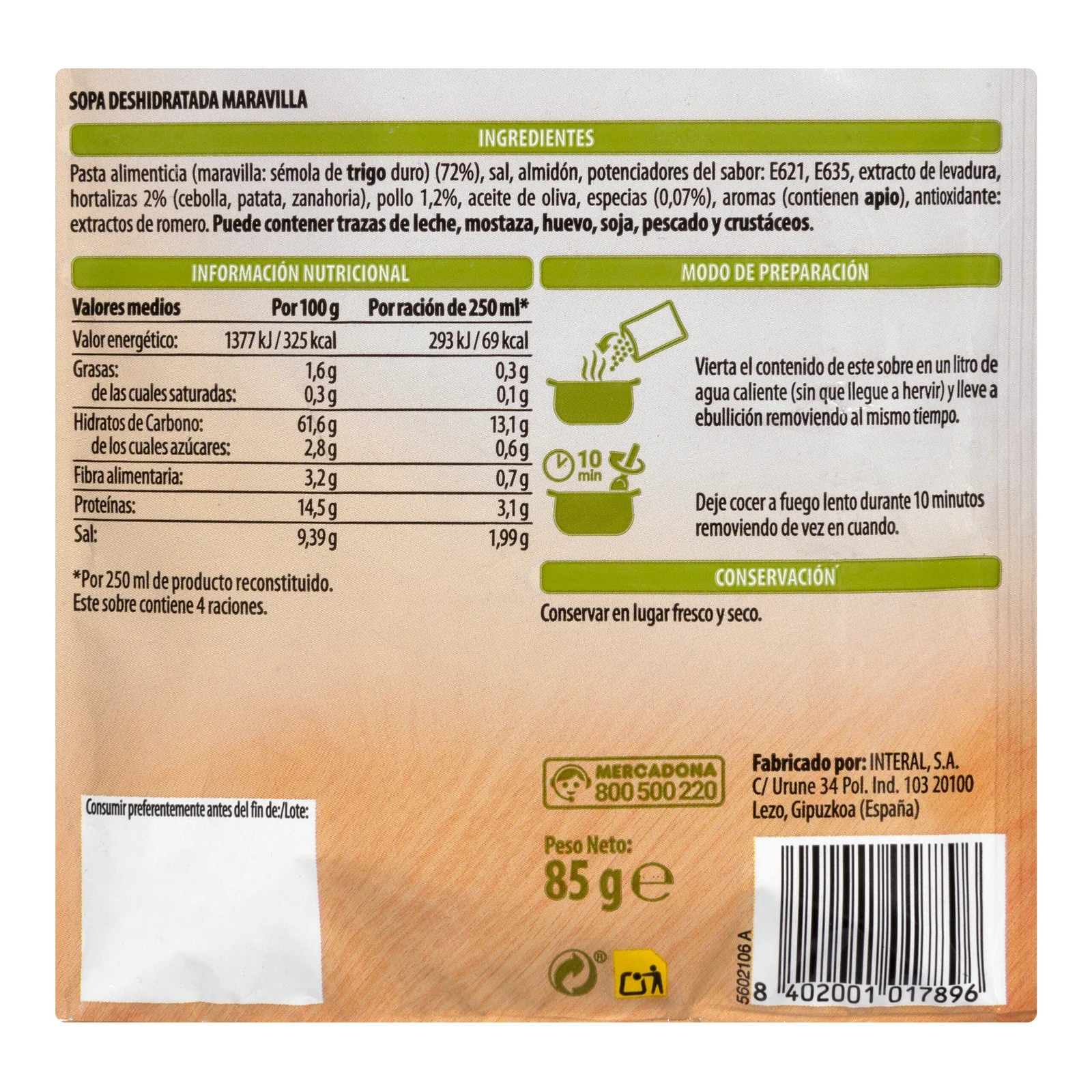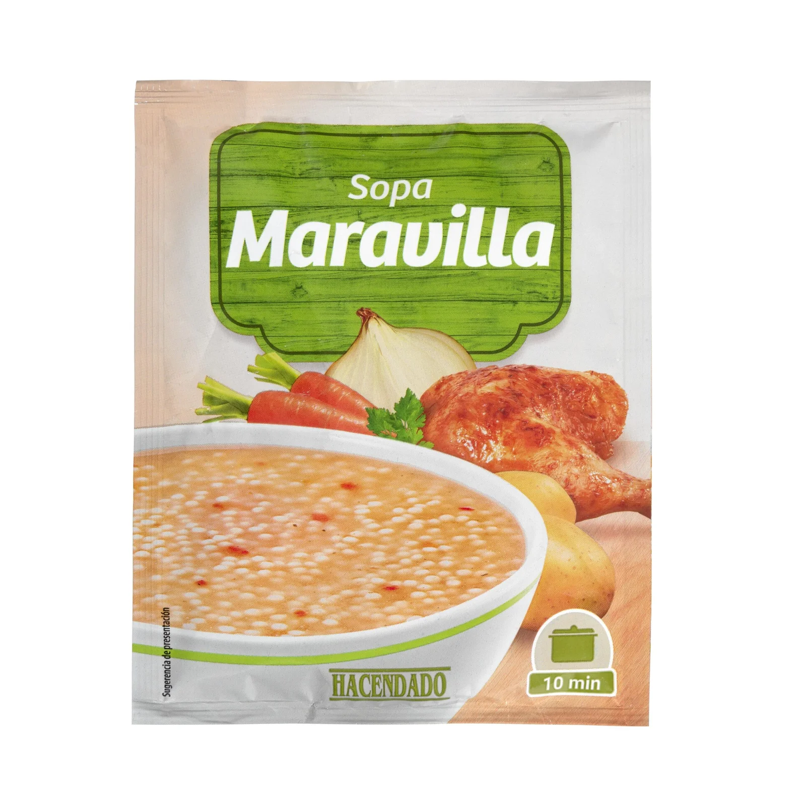 Sopa maravilla Hacendado, un clásico del mercado español. Forma parte de la variedad de sopa. Ideal para españoles fuera de Europa que buscan sabores de casa y para europeos que desean productos auténticos de España.
