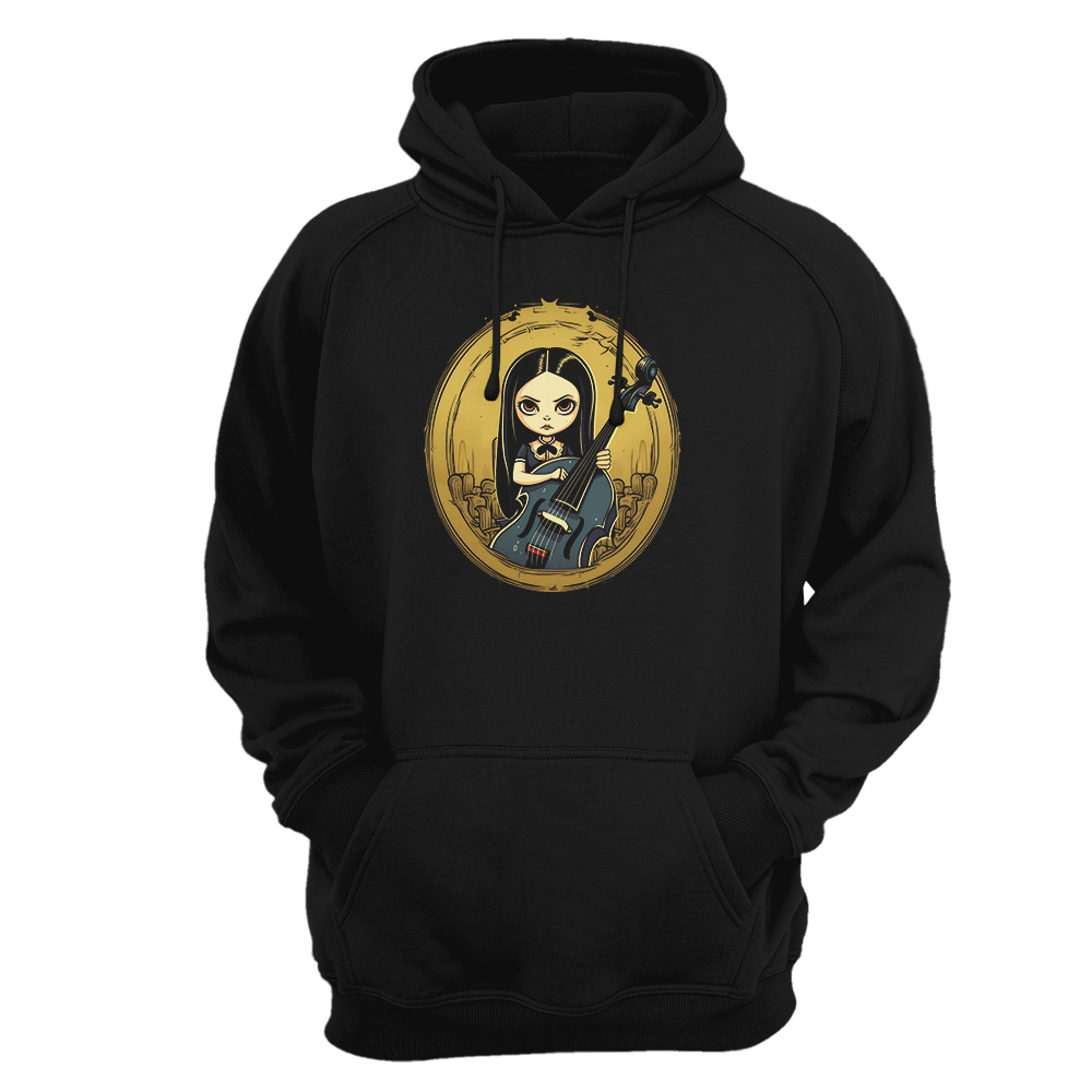 Combina calidez y estilo gótico con esta sudadera con capucha Gothic Girl – Cello Cartoon. El diseño presenta una chica gótica tocando el violonchelo, enmarcada en un elegante fondo dorado que resalta los detalles oscuros y artísticos. Ideal para quienes aman el arte oscuro y la música clásica con un giro alternativo.