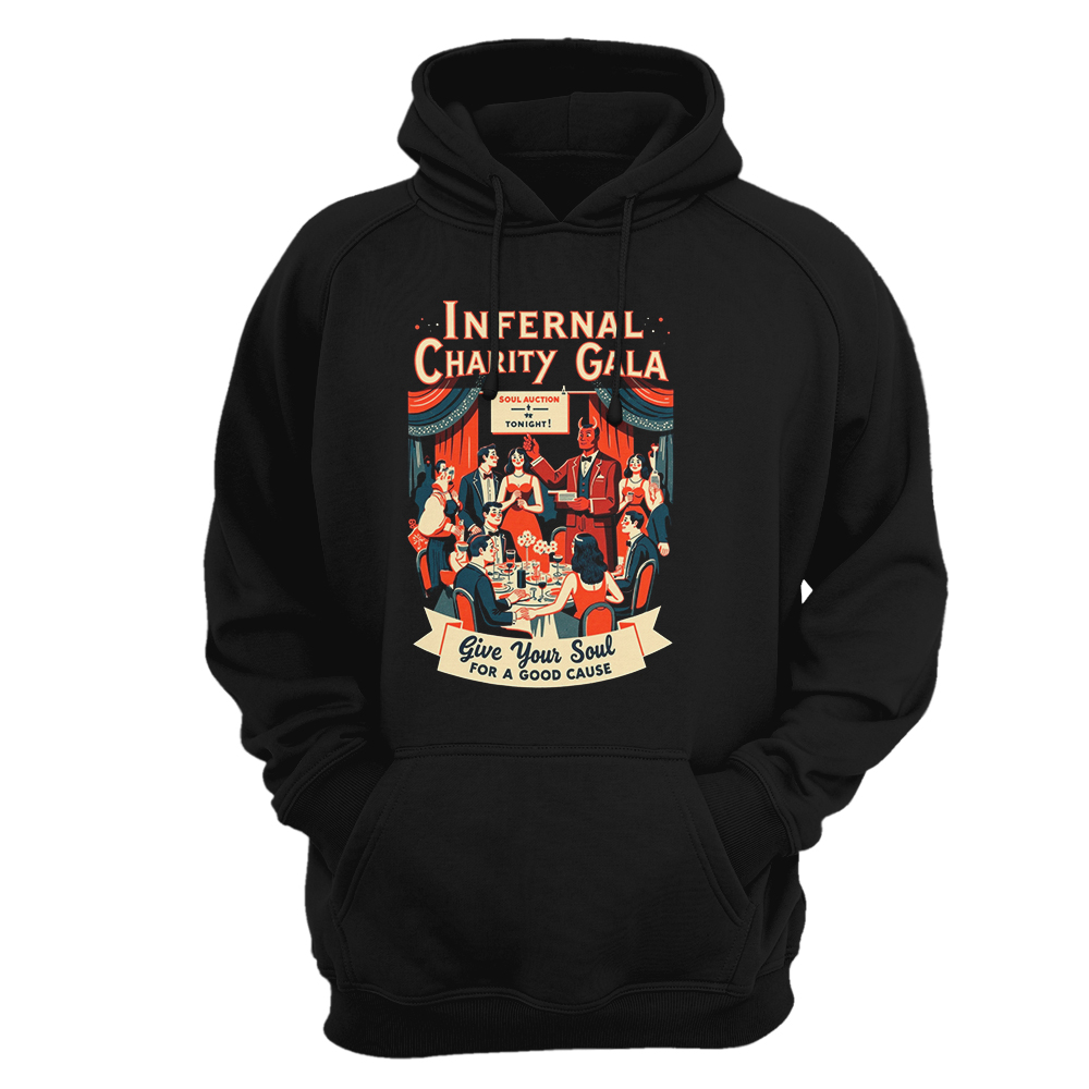 ¿Quién dijo que la caridad no podía ser infernal? Con esta sudadera “Infernal Charity Gala – Give Your Soul for a Good Cause” vas calentito y con clase, como si acabaras de salir de un evento de élite… en el octavo círculo del infierno.