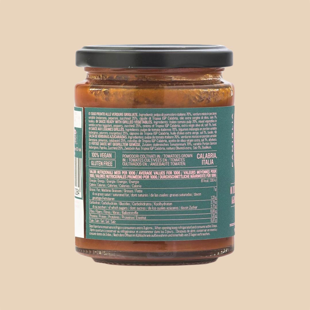 Ingredientes: pulpa de tomate italiano 70%, verduras mixtas en proporción variable (berenjena, pimiento y calabacín), cebolla de Tropea D.O Calabria, aceite de oliva virgen extra, sal y albahaca