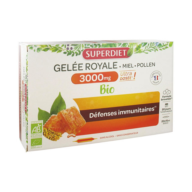 Super Diet Jalea Real 3000 mg Miel Polen Bio 20 Ampollas es un complemento alimenticio ultra-dosificado para toda la familia a partir de los 3 años.