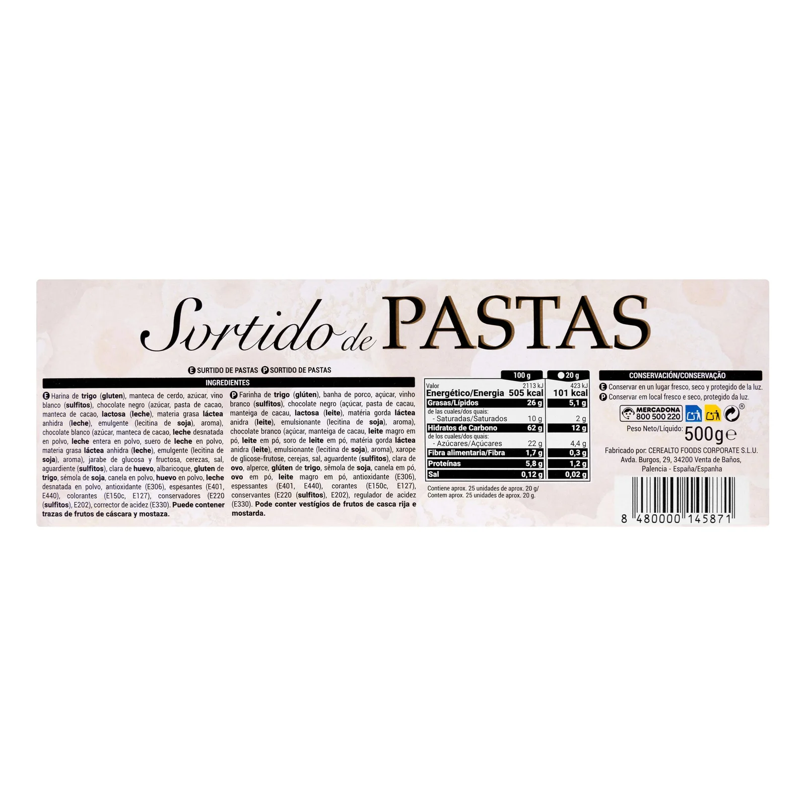 Surtido de pastas artesanas Hacendado, un clásico del mercado español. Forma parte de la variedad de galletas surtidas. Ideal para españoles fuera de Europa que buscan sabores de casa y para europeos que quieren disfrutar de productos auténticos de España.