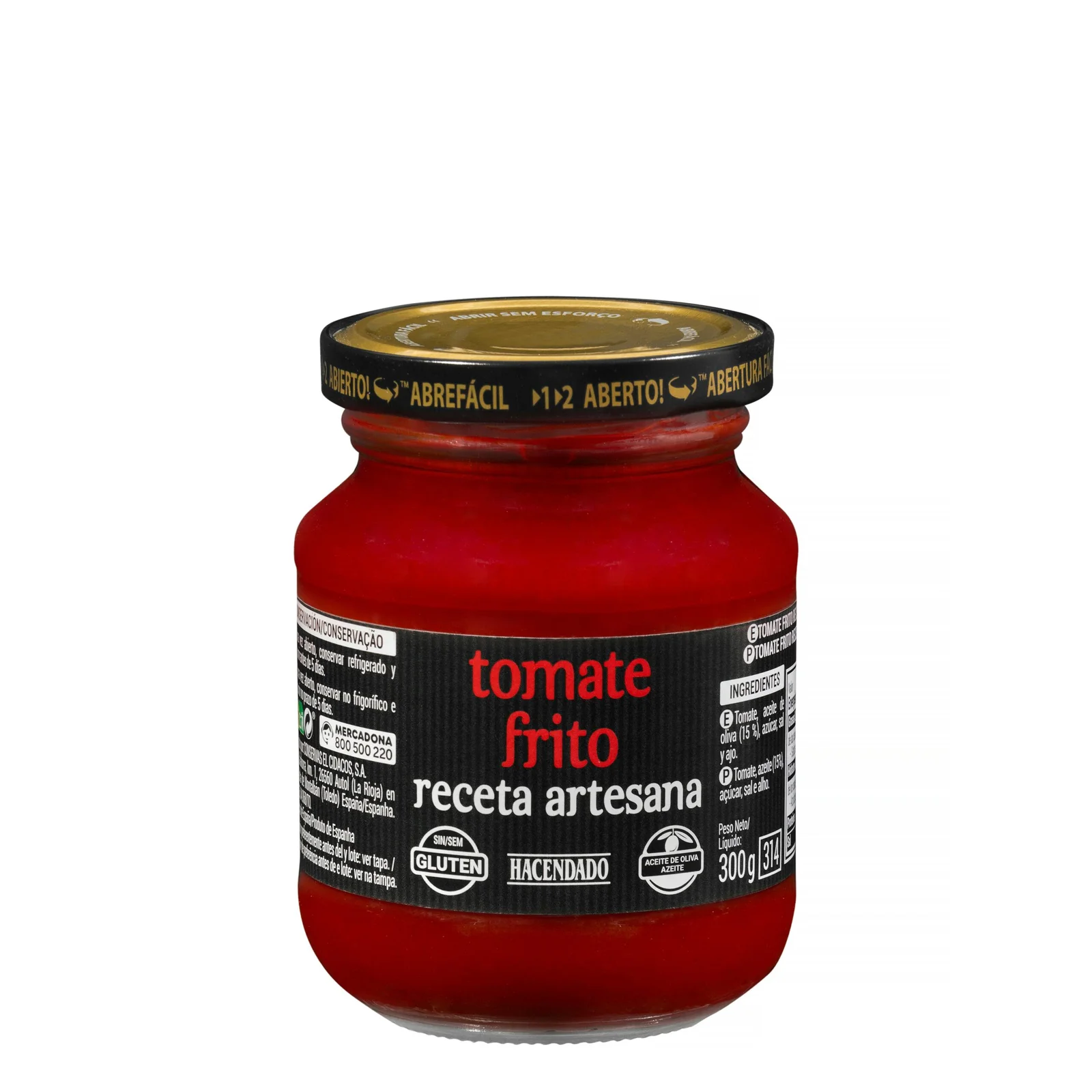 Tomate frito receta artesana Hacendado, un clásico del mercado español. Forma parte de la variedad de tomate. Ideal para españoles fuera de Europa que buscan sabores de casa y para europeos que desean productos auténticos de España.