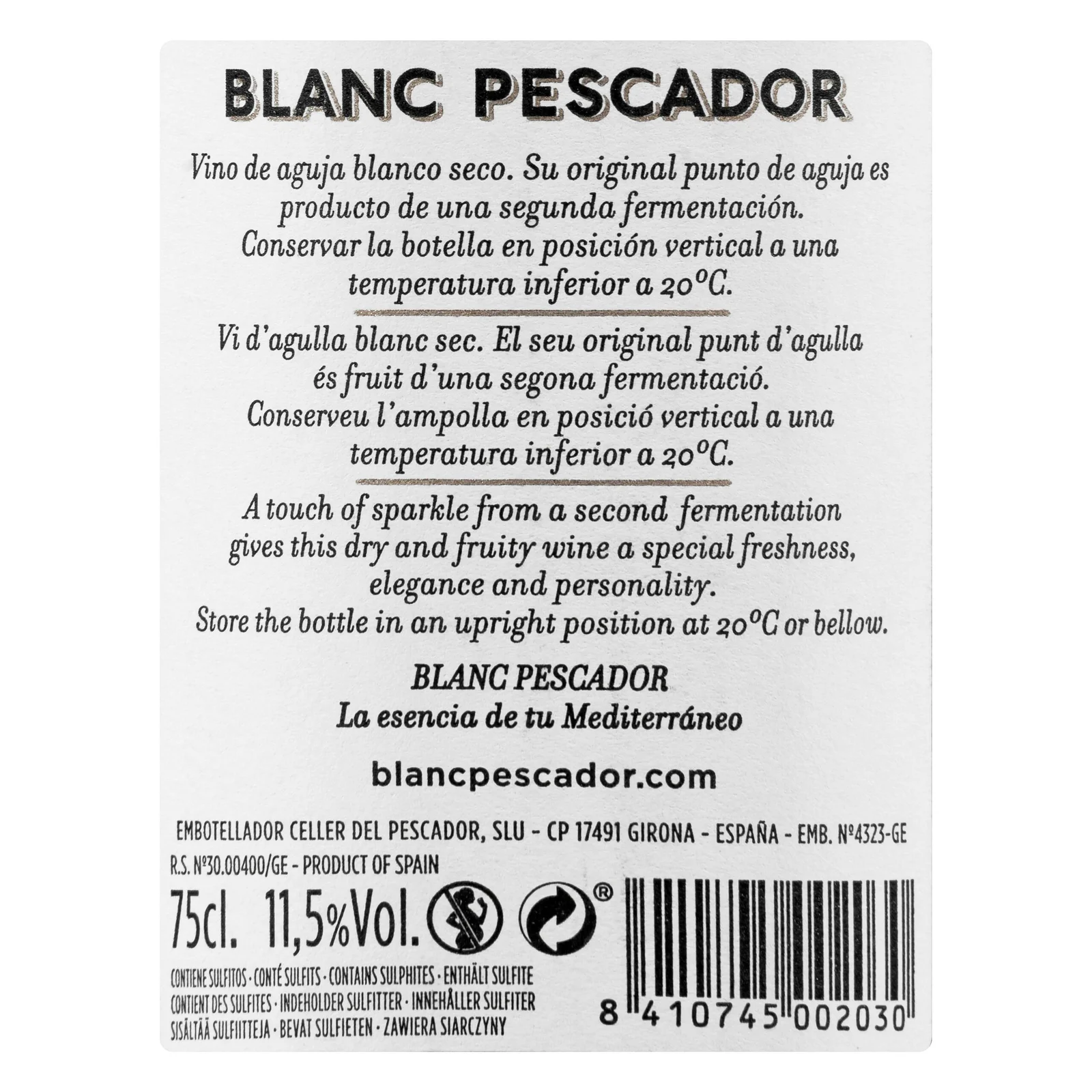 Vino blanco de aguja espumoso Blanc Pescador – producto español auténtico, ideal para quienes buscan el sabor de España en Europa.