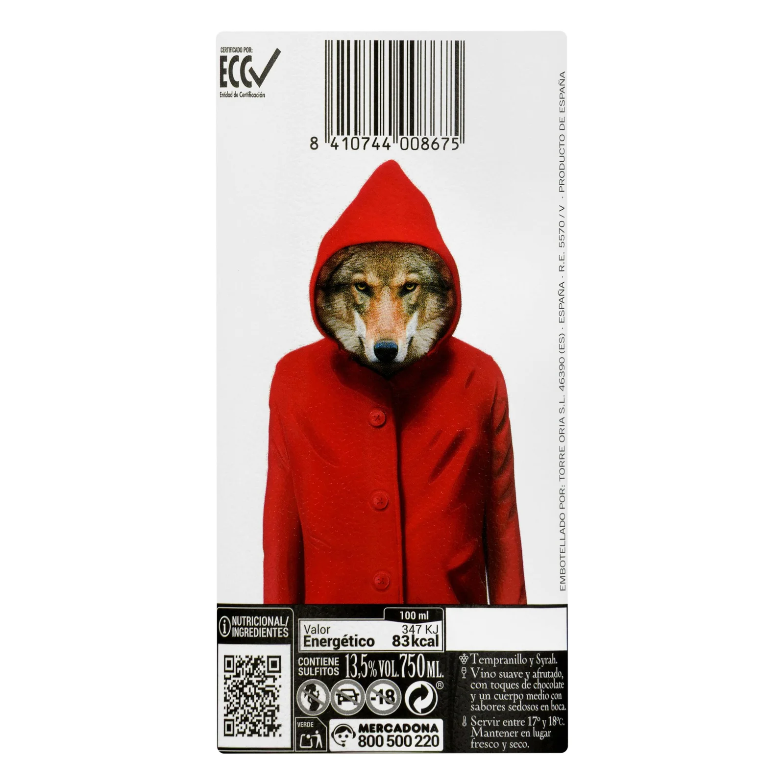 Vino tinto Caperucita tinta Torre Oria suave – producto español auténtico, ideal para quienes buscan el sabor de España en Europa.
