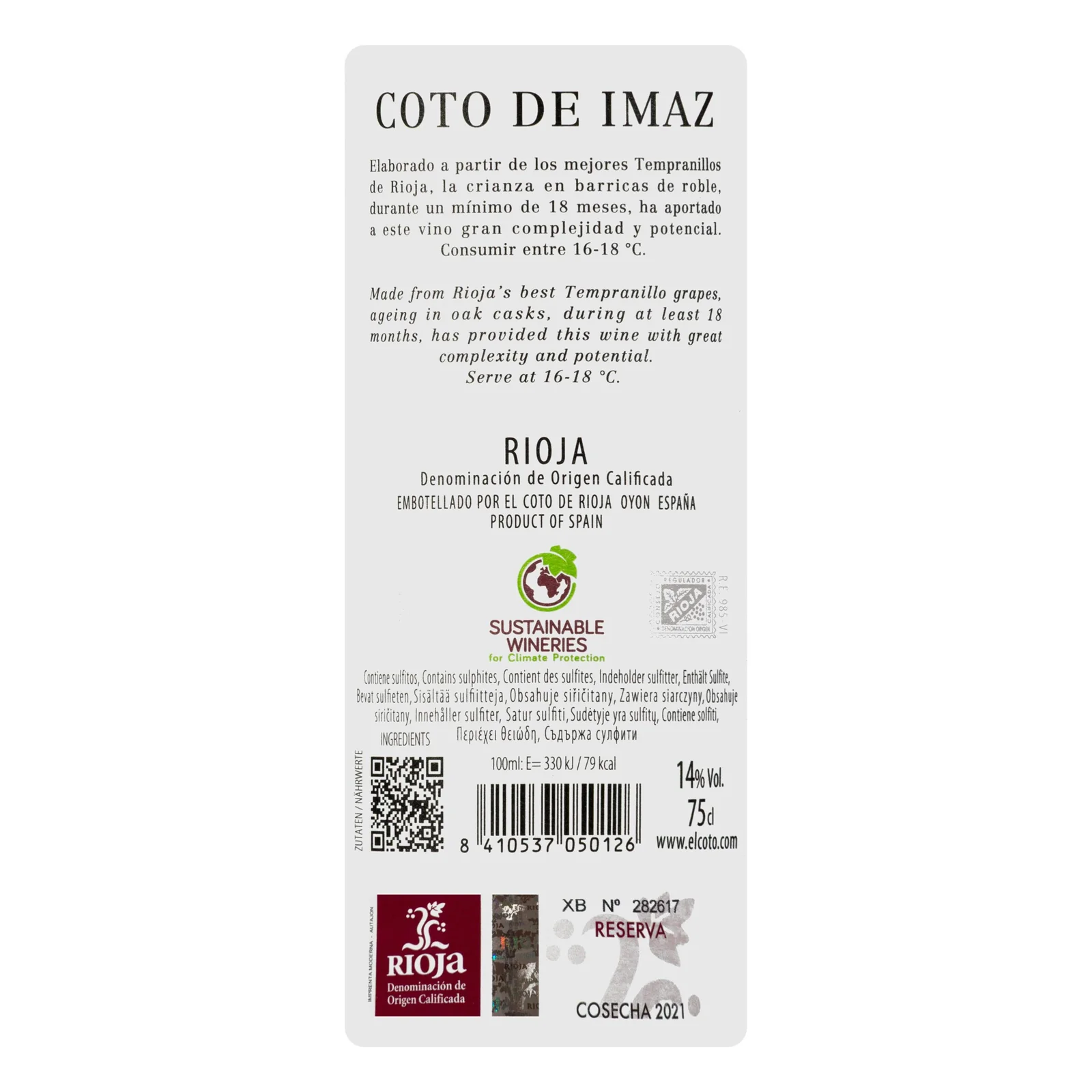 Vino tinto D.O Rioja Coto de Imaz reserva es una bebida española seleccionada, pensada para españoles que viven fuera y para amantes de la gastronomía española en toda Europa. Forma parte de nuestra categoría de Bodega y Licores > Vinos > Vino tinto, ofreciendo tradición, calidad y sabor auténtico.