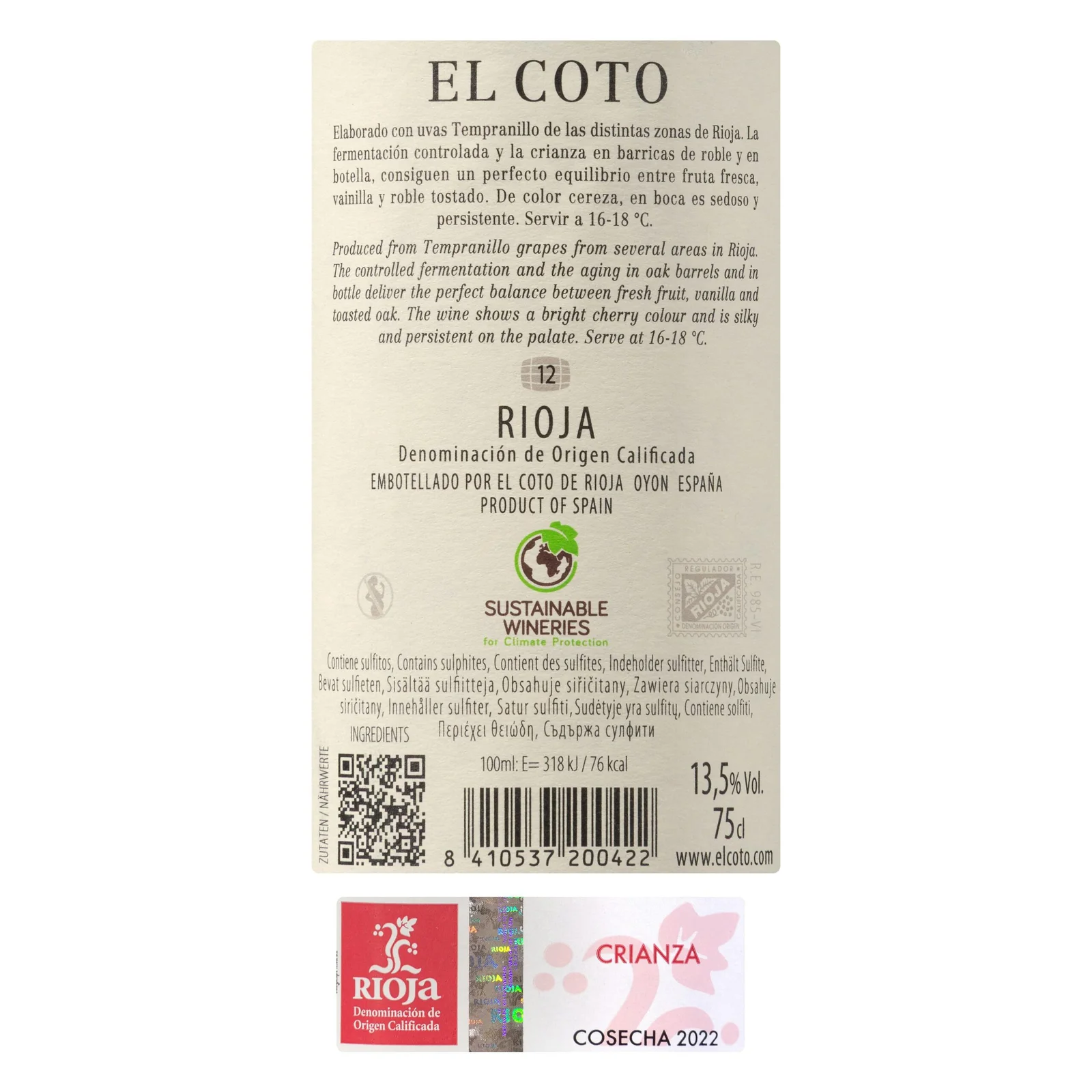 Vino tinto D.O Rioja El Coto crianza es una bebida española seleccionada, pensada para españoles que viven fuera y para amantes de la gastronomía española en toda Europa. Forma parte de nuestra categoría de Bodega y Licores > Vinos > Vino tinto, ofreciendo tradición, calidad y sabor auténtico.