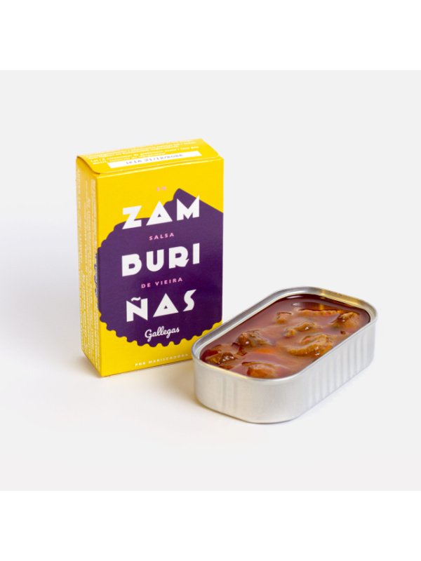 Ingredientes: Zamburiñas gallegas (Chlamys opercularis), aceite de girasol, tomate, cebolla, especias y sal.